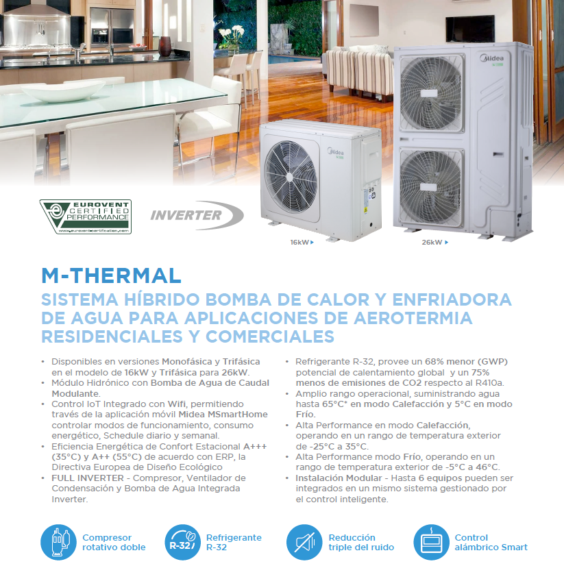 Midea M-THERMAL R-32 - Sistema Híbrido de Bomba de Calor y Enfriadora de Agua para aplicaciones de Aerotermia Residenciales y Comerciales