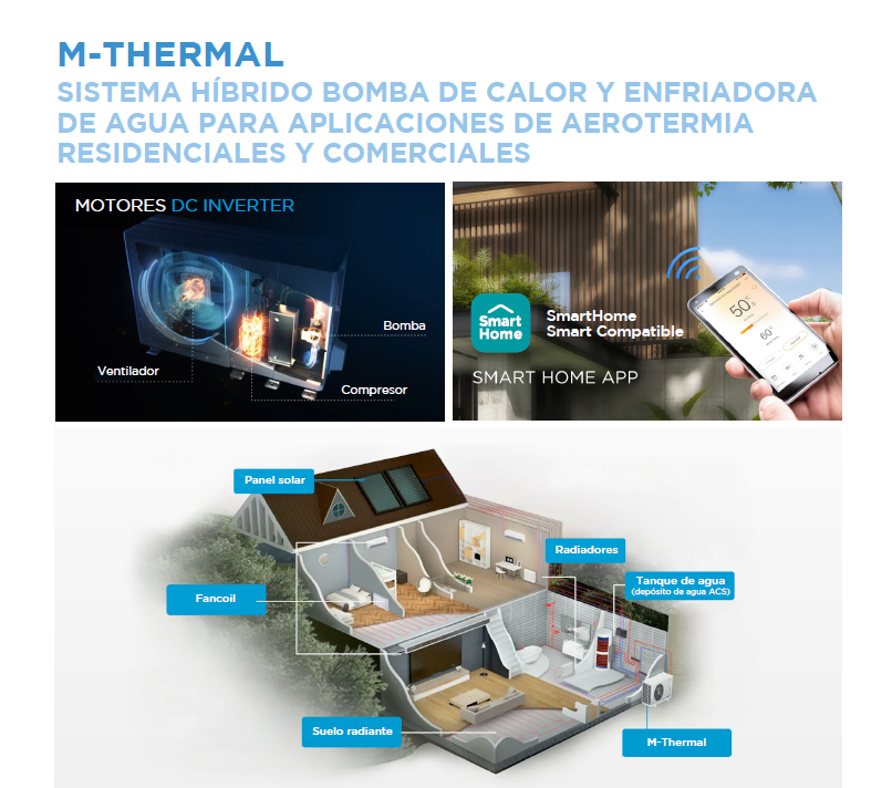 Bomba de calor del tipo aerotermia. Un sistema que proporciona calefacción y refrigeración de espacios, así como agua caliente sanitaria, ofreciendo una solución completa durante todo el año. Puede combinarse con calefacción por piso radiante, radiadores, fancoils y depósito de agua sanitaria.También puede conectarse a calderas.